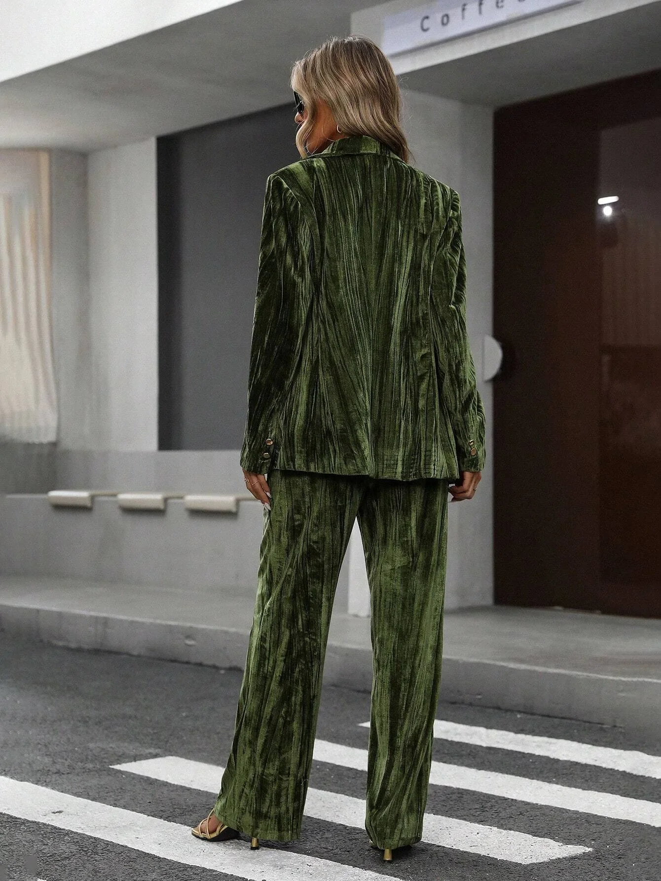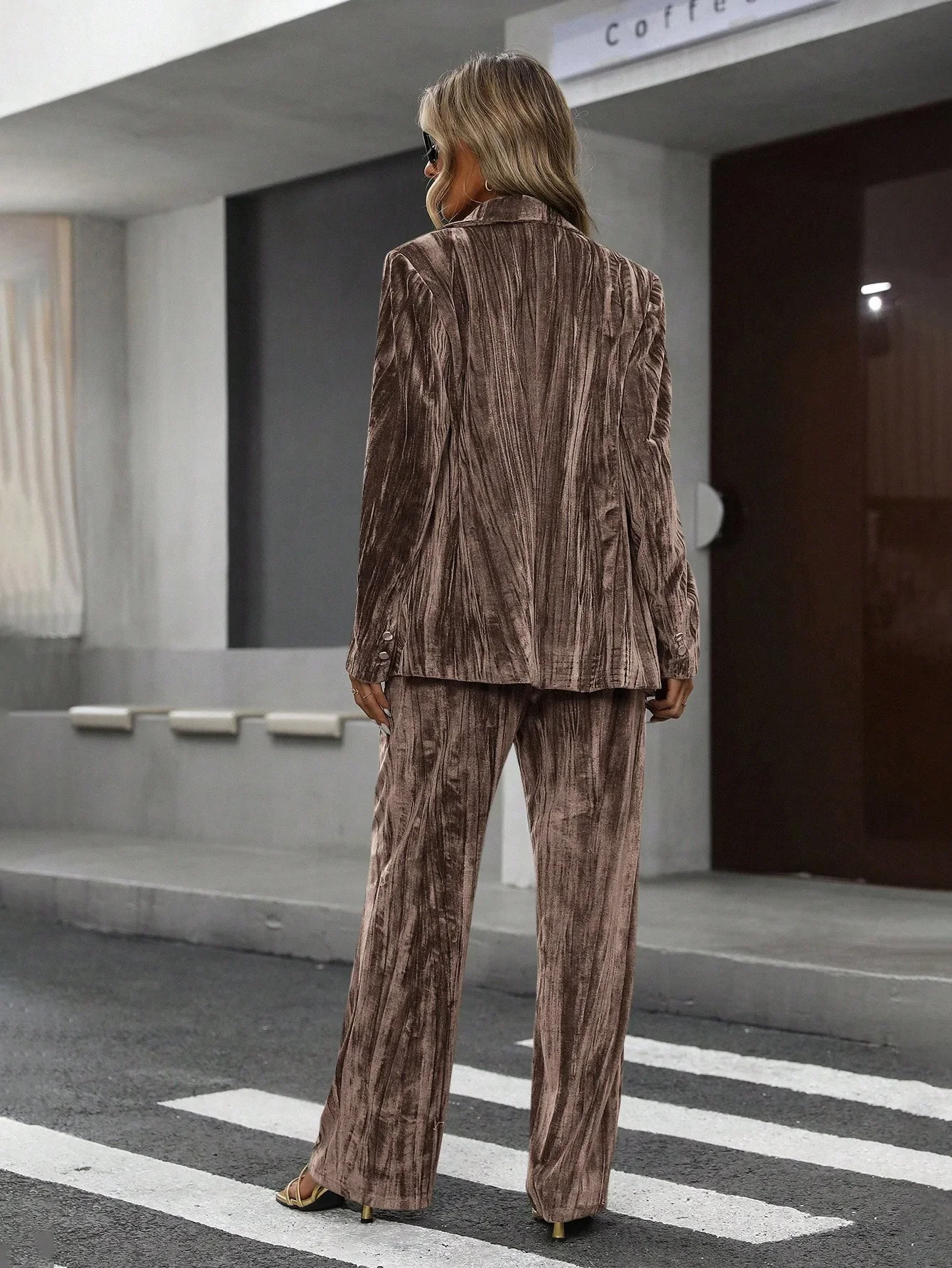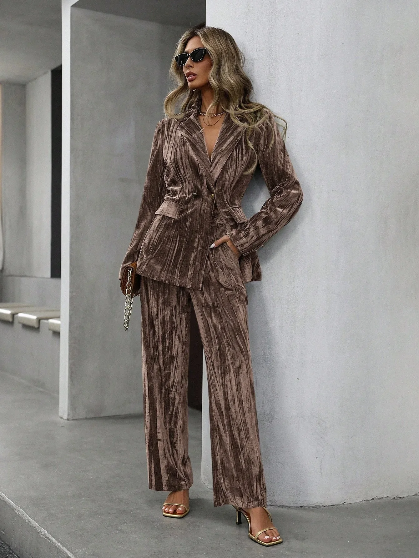 Suit Wide Leg Pants Two Piece Set Casual OL Top Long Pants Women's Ensemble Polyester Fiber Velvet Fabric